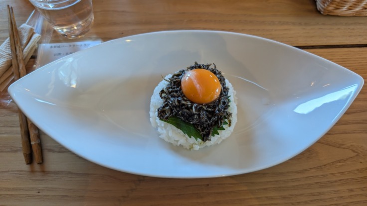 メインは七ヶ浜のひとめぼれに閖上のシラスを海苔だれで和えて白石の卵をのせた逸品
